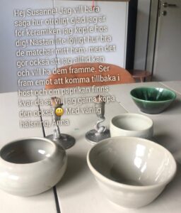 2020 började jag med keramik igen. Ett uppehåll på ungefär 25 år. Den här gången lärde jag mig att dreja på ”youtubeuniversitetet”. Vidare har jag gått kurser hos många fina keramiker. Jag säljer min keramik på Möja i Stockholms skärgård