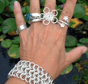 Det var där mitt eget hantverk började. Metall linjen på Folkuniversitetet. Det var superläskigt att söka in. För inte kunde väl jag. Jag är inte tillräckligt konstnärlig för det….Jag kom in…Några år senare var jag lärare i silverlera och glasfusing på just folkuniversitetet. Även